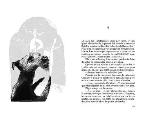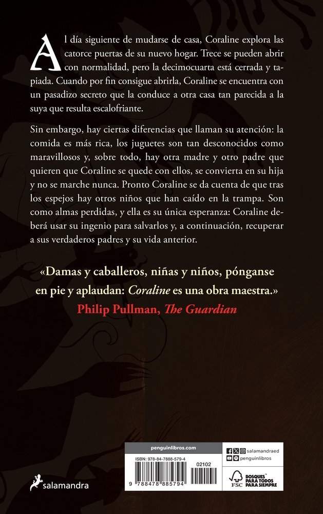 El día siguiente de mudarse de casa, Coraline explora las catorce puertas de su nuevo hogar. Trece se pueden abrir con normalidad, pero la decimocuarta está cerrada y tapiada. Cuando por fin consigue abrirla, Coraline se encuentra con un pasadizo secreto que la conduce a otra casa tan parecida a la suya que resulta escalofriante. Sin embargo, hay ciertas diferencias que llaman su atención: la comida es más rica, los juguetes son tan desconocidos como maravillosos y, sobre todo, hay otra madre y otro padre que quieren que Coraline se quede con ellos, se convierta en su hija y no se marche nunca. Pronto Coraline se da cuenta de que, tras los espejos, hay otros niños que han caído en la trampa. Son como almas perdidas, y ahora ella es su única esperanza de salvación. Pero para rescatarlos tendrá también que recuperar a sus verdaderos padres, y cumplir así el desafío que le permitirá volver a su vida anterior.