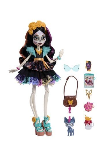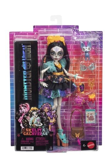 ¡Aquí está Skelita Calaveras! Esta muñeca Monster High es un esqueleto aterradoramente creativo procedente de Hexiko. Cuenta con siete accesorios brillantes y embrujadores, y tiene un perrito xolo llamado Candelita. ¡A los niños o coleccionistas les encantará añadir la espeluznante muñeca Skelita Calaveras a su colección Monster High! Totalmente articulada. La muñeca no se mantiene de pie por sí sola. El color y el diseño pueden variar.