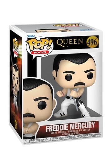 Funko POP de Freddie Mercury con camiseta blanca, inspirado en Queen. Figura imprescindible para colección.